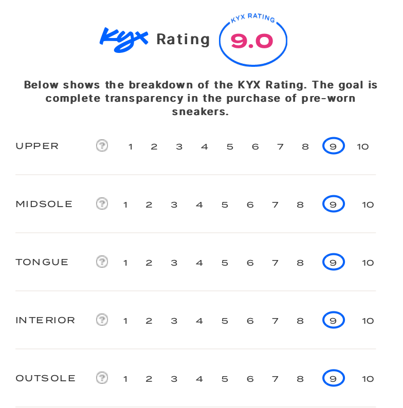 Below shows the breakdown of the KYX Rating. The goal is complete transparency in the purchase of pre-worn sneakers.